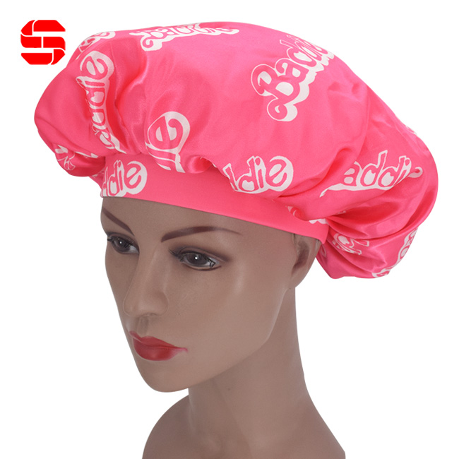 Customized Double Layers Satin Designer Bonnet made with luxurious satin fabric, featuring double layers and designer printing. It supports custom logos and designs, suitable for daily life, sports, and decoration. With a minimum order of 20 pieces per design, it offers versatile usage and multiple head circumference options to fit adults comfortably.