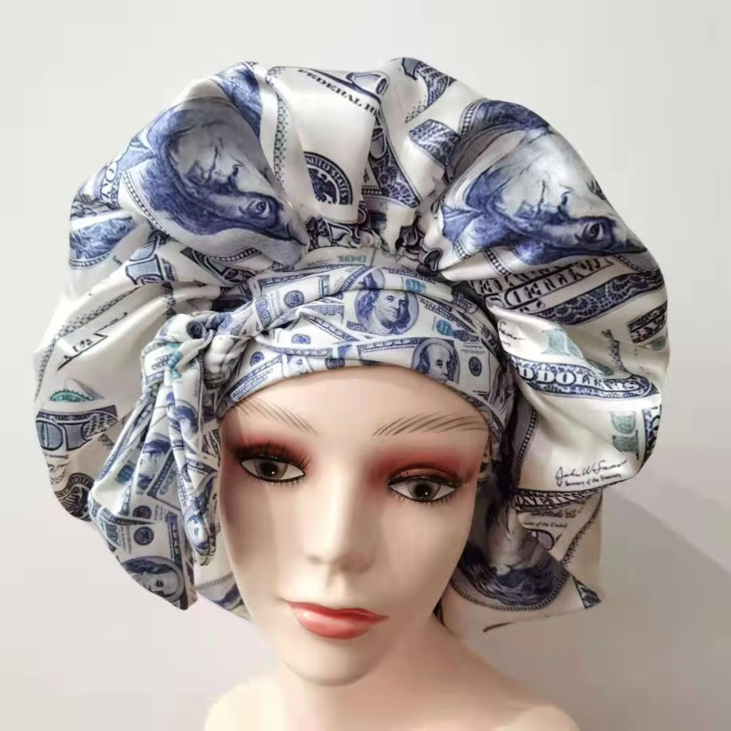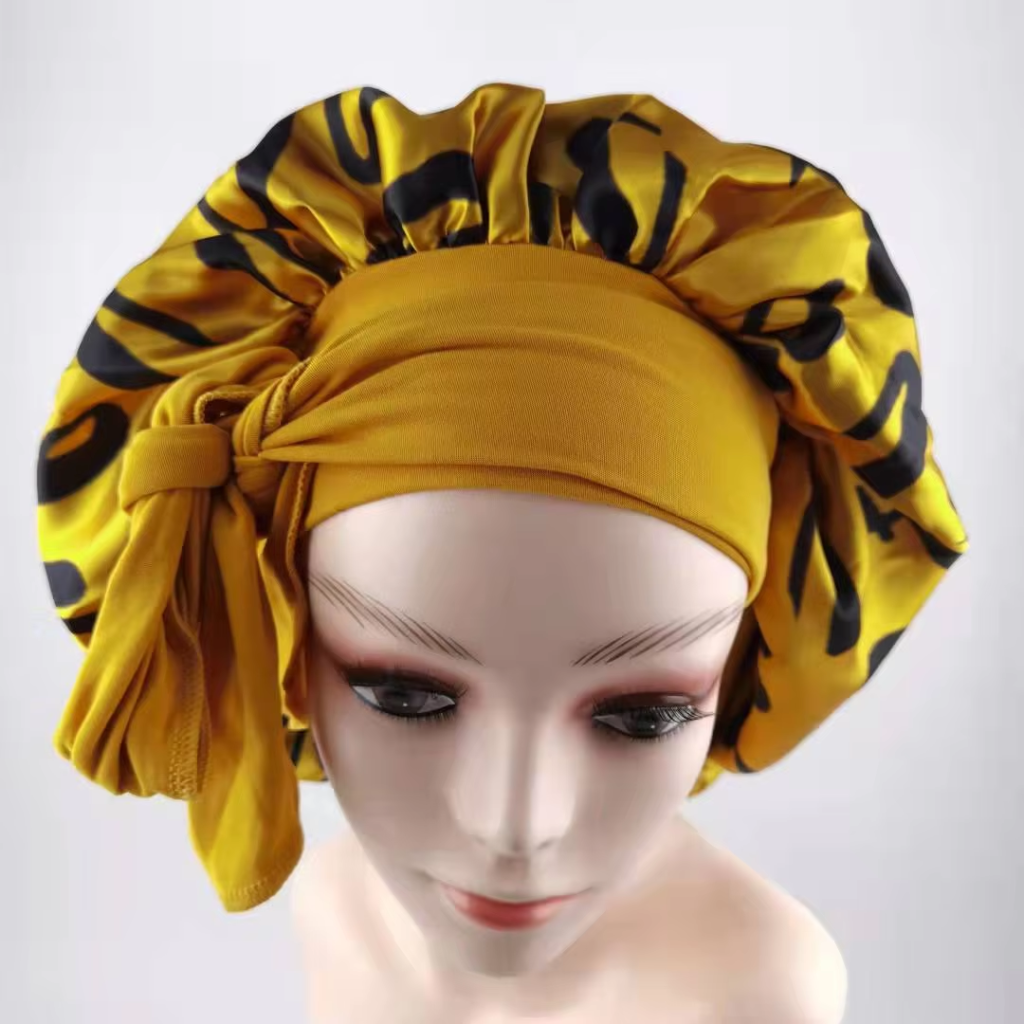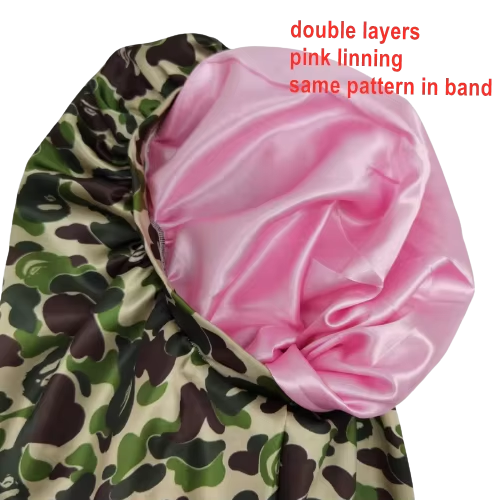 Customized Double Layers Satin Designer Bonnet made with luxurious satin fabric, featuring double layers and designer printing. It supports custom logos and designs, suitable for daily life, sports, and decoration. With a minimum order of 20 pieces per design, it offers versatile usage and multiple head circumference options to fit adults comfortably.